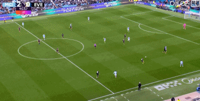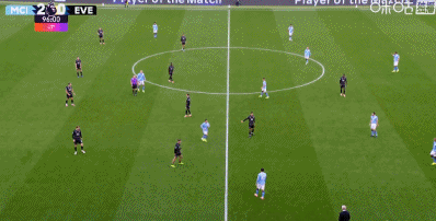 伤停补时阶段,第92分钟,福登在中路送出了一记精妙的直塞球打穿埃弗顿防线,哈兰德差点跑出单刀,可惜没有停好球,接着射门被皮克福德挡出,随后的补射也被后卫挡出。