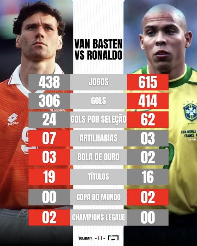 最近,知名足球媒体发布了「传奇前锋八项对比榜单」,直面对比范巴斯滕与罗纳尔多。表上看,俱乐部端是欧冠冠军×2、金球奖×3的范巴斯滕更亮;国家队与世界杯,则是罗纳尔多更硬。到底欧冠的含金量能不能顶过世界杯×2?往下看见分晓。